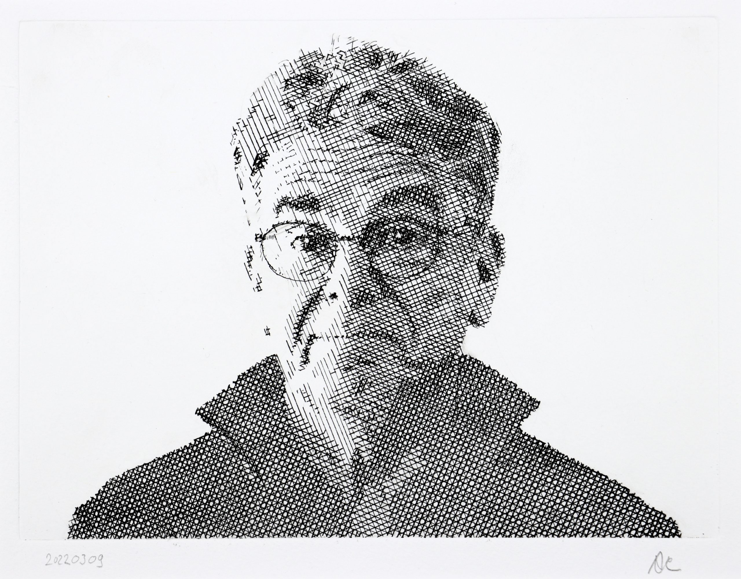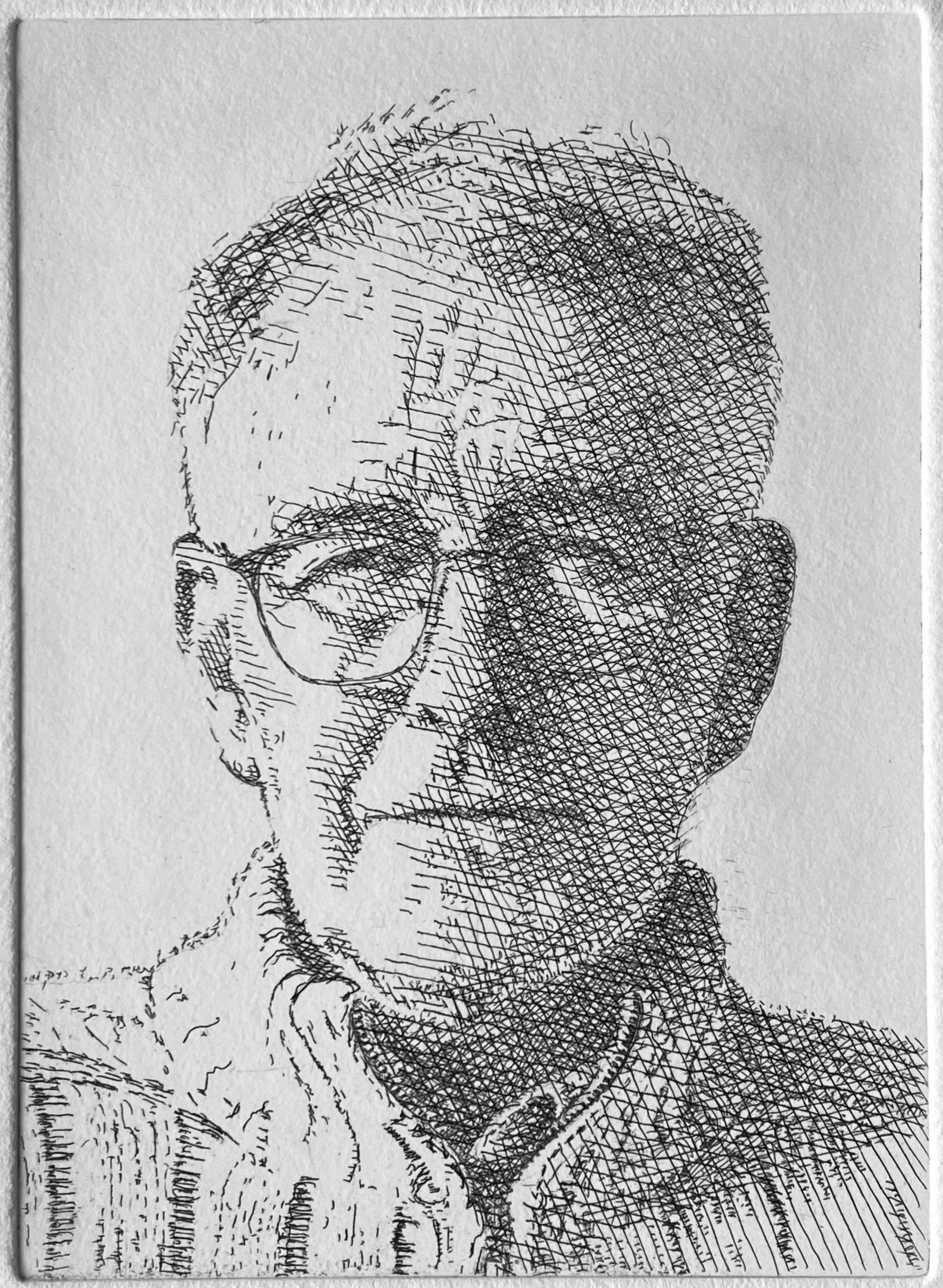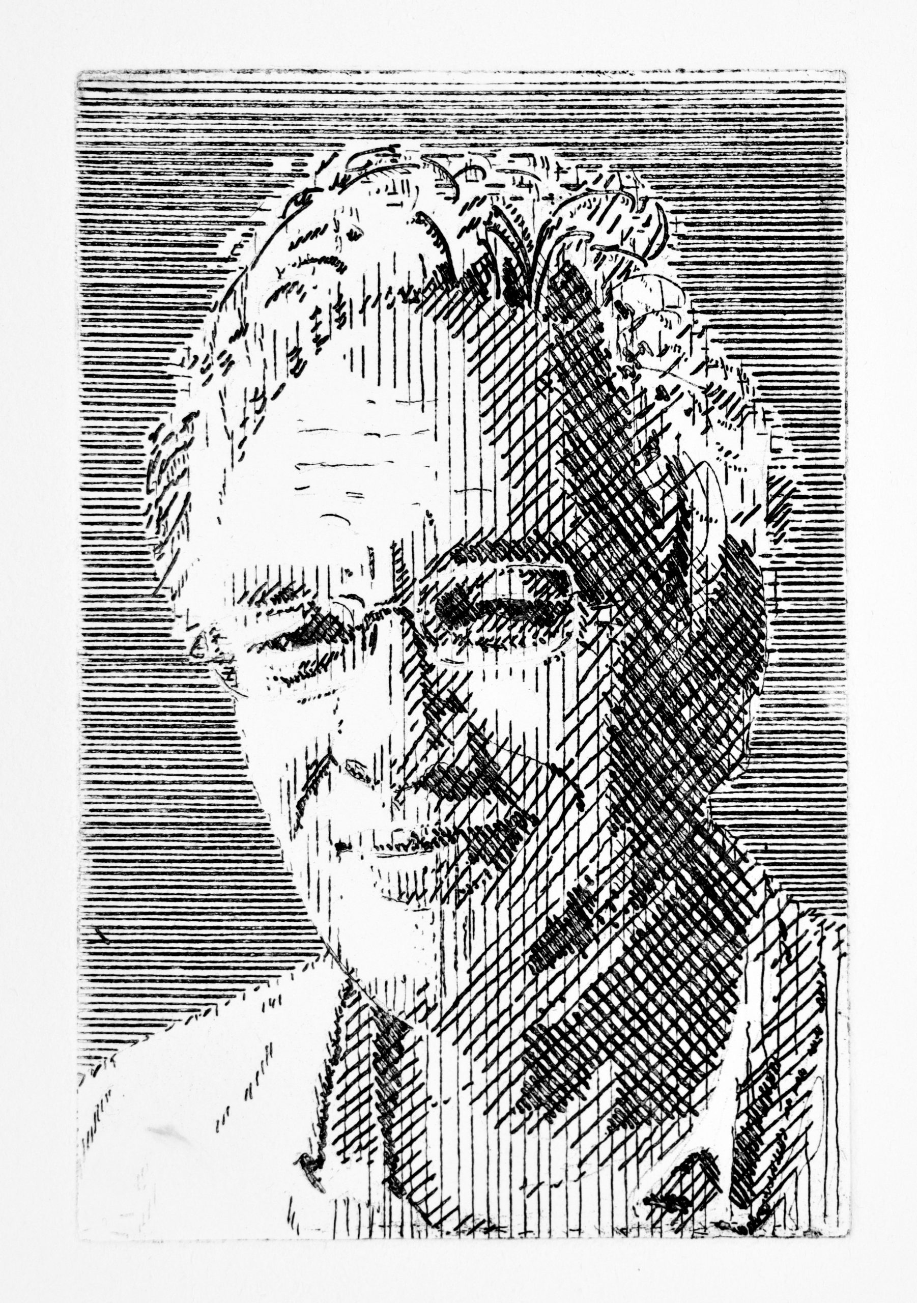 Kees op een winderige dag in Dordrecht. Z'n witte haren waren een uitdaging om in de ets terug te laten komen...