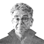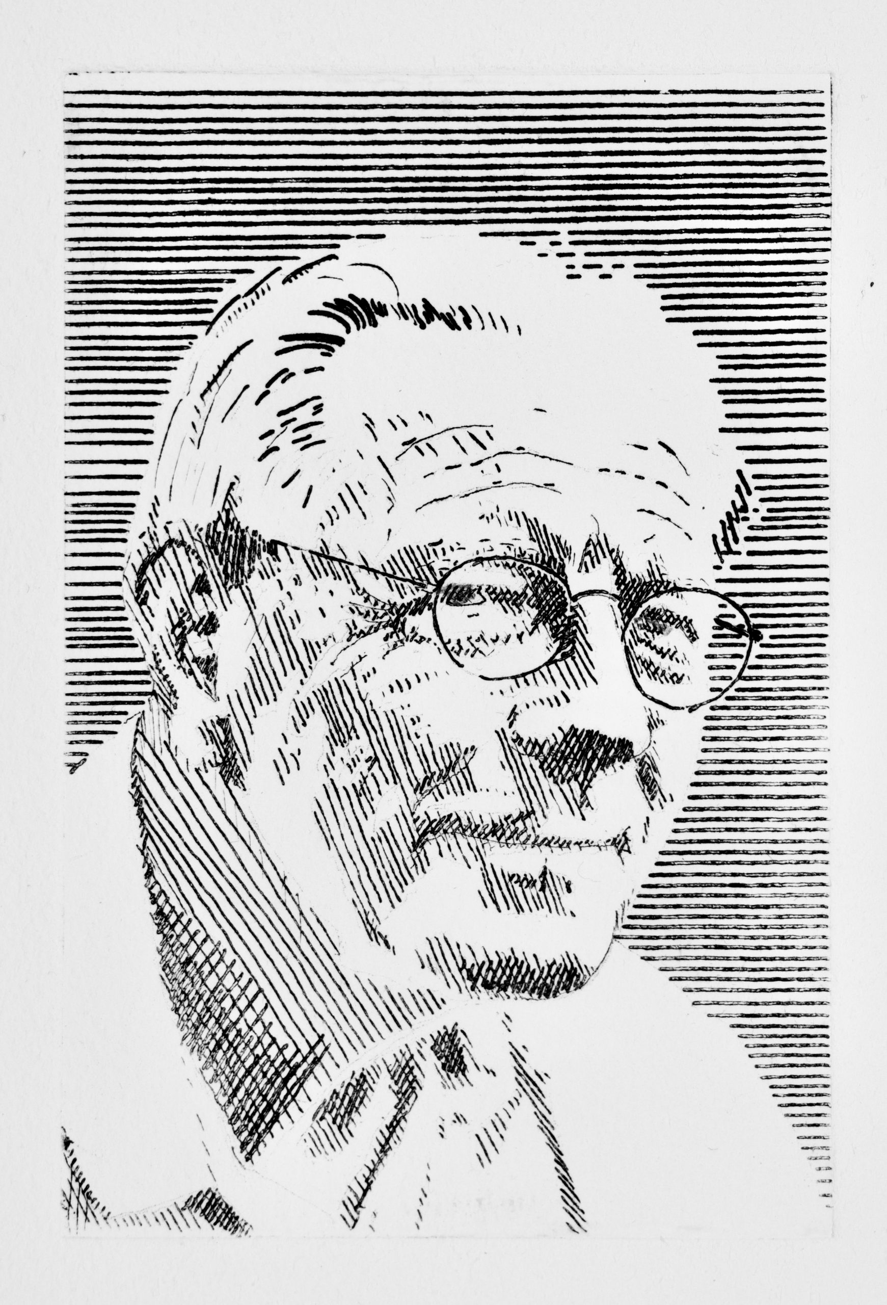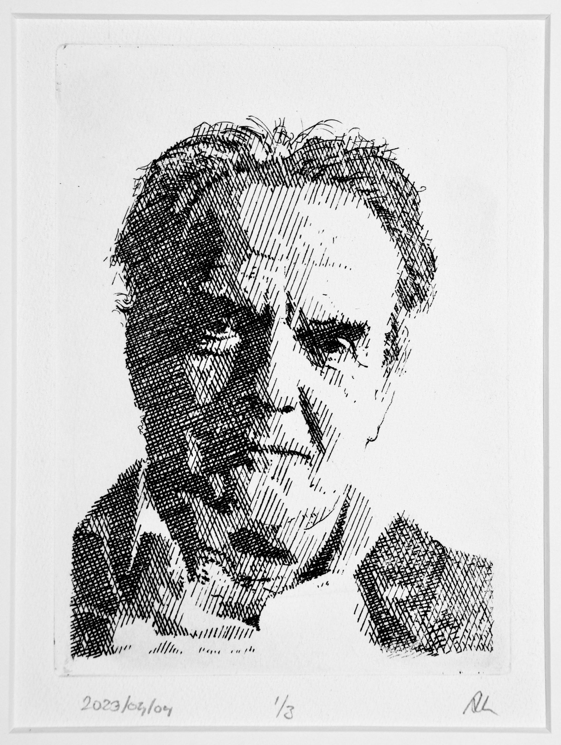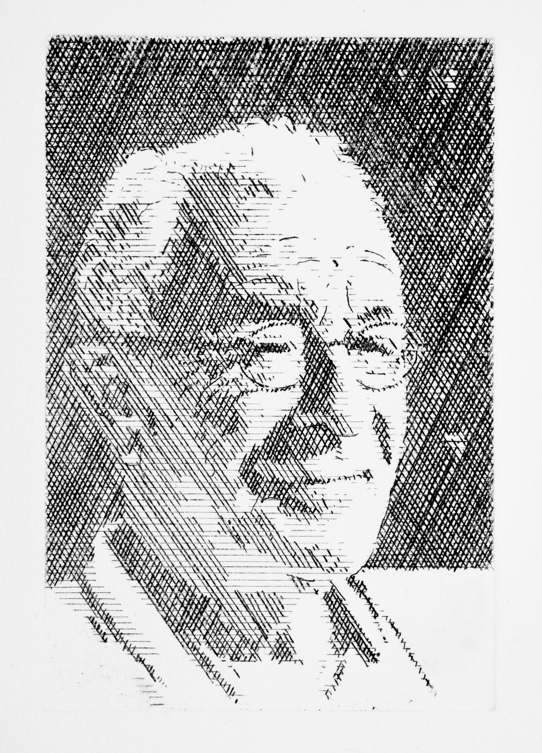 Kees op een winderige dag in Dordrecht. Z'n witte haren waren een uitdaging om in de ets terug te laten komen...